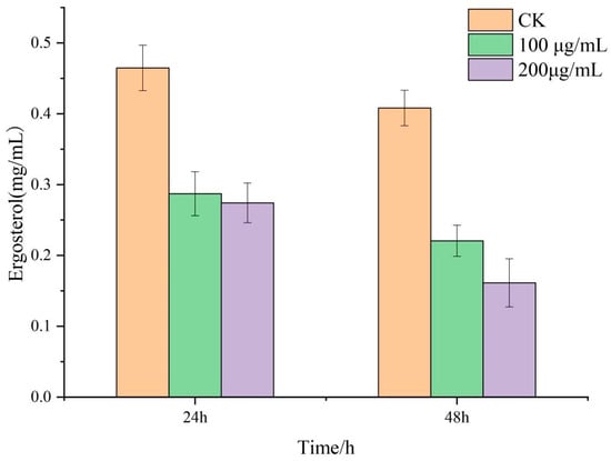 Ergosterol, as a unique component of fungal cells, interacts with hydrocarbon bonds on the cell membrane and plays an important role in maintaining membrane fluidity and stabilizing membrane structure []. Ergosterol is often used as a target for many antifungal drugs because it only acts in fungal cells []. Zhang et al. found that pectin lyase induced the upregulation of ERG4 in cotton Verticillium wilt Vd080, increased the content of ergosterol in the cell membrane, and induced the apoptosis of the pathogen []. This is consistent with our results. After the treatment of R. solani with lauric acid, the ergosterol content in the mycelium decreased significantly, the synthesis pathway of ergosterol was blocked on the cell membrane, and the cell membrane formed small holes. Consequently, the fluidity and stability decreased. Lauric acid affects the integrity of R. solani, through changes in the balance of internal and external osmotic pressure, physiological balance, and so on, which inhibits the mycelium growth of R. solani.