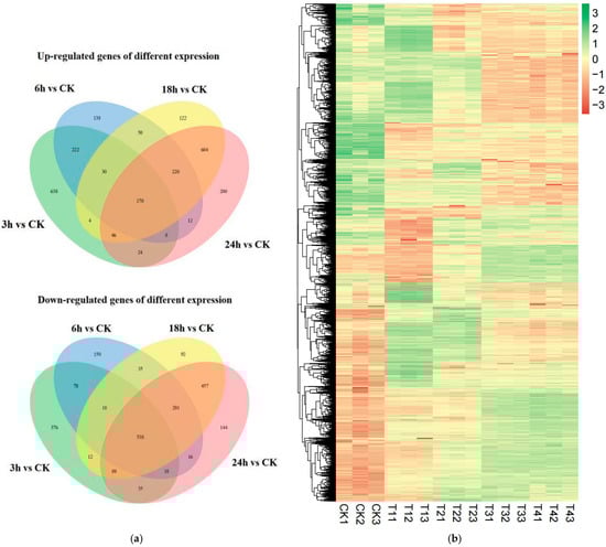Differentially expressed genes (DEGs) analysis. (a) Venn diagram of numbers of the DEGs in different samples. (b) Heatmap and cluster analysis of DEGs among different samples using complete linkage. The gene expression level increases with blue to red. CK, samples treated with distill water; 3 h, samples treated with lauric acid for 3 h; 6 h, samples treated with lauric acid for 6 h; 18 h, samples treated with lauric acid for 18 h; 24 h, samples treated with lauric acid for 24 h.