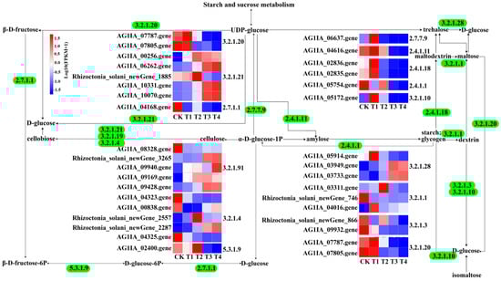 Selected genes related to starch and sucrose metabolism in R. solani under four treatments. Bounding boxes represent metabolic processes or metabolite, and digits represent regulatory enzyme for a specific process. Straight arrows indicate the transformational direction of a metabolite (solid and dotted lines correspond to direct and indirect effects). The colors indicate the level of each gene’s expression based on FPKM normalized read counts.