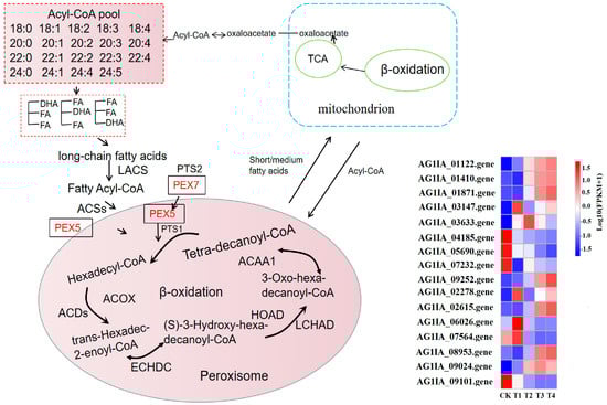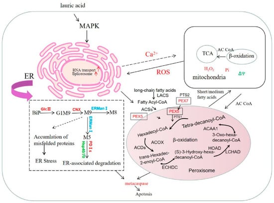 The fatty acid metabolism of R. solani is activated in the peroxisome, and acyl-CoA synthase (EC: 6.2.1.3; ACSs) catalyzes the production of fatty acyl coenzyme A, which has high-energy bonds in its molecule and is active in nature. Peroxisomal biogenesis factor 5 (PEX5) combines with peroxisomal targeting signal type 1 (PTS1) and enters the peroxisome; then, the long-chain acyl-CoA synthetase (EC: 6.2.1.3; LACS) gene is upregulated to catalyze the generation of hexadecyl coenzyme A. Acyl-CoA oxidase (EC: 1.3.3.6) in lauric acid-treated R. solani (ACDs) gene is upregulated with fatty acyl-CoA dehydrogenase (acyl-CoA dehydrogenase, EC: 1.3.8.8; ACOX) and produces trans-hexadecyl-2-enoyl coenzyme A, which is reacted with enoyl-CoA hydratase (enoyl-CoA hydratase, EC: 4.2.1.17; ECHDC) and is further catalyzed to (S)-3-hydroxy-hexadecyl-coenzyme A. The gene for 3-hydroxyacyl-coenzyme A dehydrogenase (3-hydroxyacyl-coa dehydrogenase, EC: 1.1.1.35; HOAD) is upregulated, and then reacted with long chain hydroxyacyl-CoA dehydrogenase long-chain 3-hydroxyacyl-CoA dehydrogenase, EC: 1.1.1.211; LCHAD) to produce 3-oxoisopentenyl coenzyme A, which is catalyzed by acetyl-CoA acyltransferase (EC: 2.3.1.16; ACAA). This catalyzes the production of coenzyme A and tetradecanoyl coenzyme A. After β-oxidation, the carbon chain of fatty acid is shortened, then acyl coenzyme A and medium/short chain acyl coenzyme A enter mitochondria and undergo β-oxidation, finally forming acetyl coenzyme A, which provides energy or other ways for the substrate to enter the body through the tricarboxylic acid (TCA) cycle (Figure 8). Under lauric acid stress, in order to resist the poison of lauric acid, the fatty acid metabolism and degradation process in the pathogen produced excessive oxygen free radicals, changed the membrane structure, and oxidized the cell membrane, which led to the destruction of the membrane structure of mitochondria or ER, finally inducing cell apoptosis.