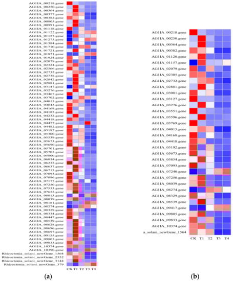 R. solani mycelium (1 g) was suspended in culture using PDB liquid medium containing 150 µg/mL of lauric acid and was oscillated at 150 r/min for 0 h, 3 h, 6 h, 18 h, 24 h, then centrifuged to collect the mycelium. Then, it was dried on a filter paper and freezed quickly using liquid nitrogen. Afterwards, the samples were wrapped in dry ice and sent to Beijing Baimaike Biotechnology Co., Ltd. for the next RNA extraction, Illumina library construction, and RNA-Seq sequencing. The AG-1 strains without lauric acid treatment were used as control. Three biological replicates were taken for all samples. The genome (R. solani AG1-IA) of R. solani was selected as reference sequence in this study (http://genedenovoweb.ticp.net:81/rsia/index.php?m=index&f=index, accessed on 23 July 2021).