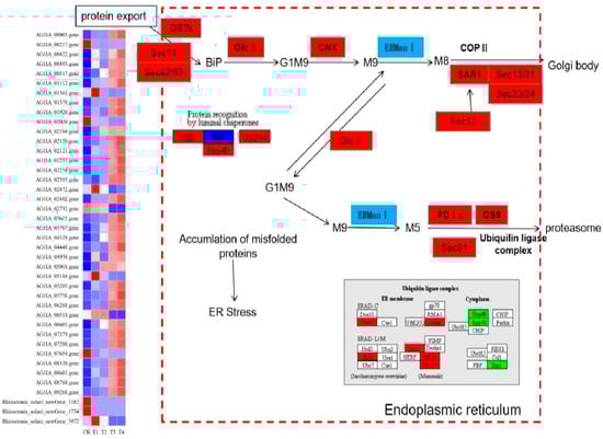 Forty-five DEGs of R. solani induced by lauric acid were related to the ER protein processing pathway. In the ER protein processing pathway, the calcium calnexin (CNX) gene and glucose regulatory protein 94 gene (GRP94) were upregulated, which indicated that ER protein processing mainly focused on the degradation pathway (ERAD), and differentially expressed genes which mainly participated in three processes of substrate recognition, transport and degradation by proteasome after ubiquitination in the ERAD pathway (Figure 10). Derlin, which promotes the release of substrate during transportation, upregulated its expression, and transmits the protein to the related enzyme gene OS-9 and XTP3-B of the ubiquitinase complex. The heat shock protein (HSP) protein family can bind unfolded or misfolded proteins and promote their correct folding. The HSP40, HSP70, and HSP90 genes were all downregulated; thus, proteins could not fold correctly. Among the DEGs in the ubiquitinase complex components, the core component of the HRD1/HRD3 ubiquitinase complex, the HRD1 ubiquitin ligase gene was upregulated, while the E2 ubiquitin binding enzyme gene Skp1 was downregulated, so that the ubiquitinase complex cannot be formed, and the substrate protein cannot be ubiquitinated. These results indicated that the ER-associated degradation (ERAD) system of R. solani treated with lauric acid could not accurately degrade unfolded or misfolded proteins, thus inducing the apoptosis of R. solani cells.