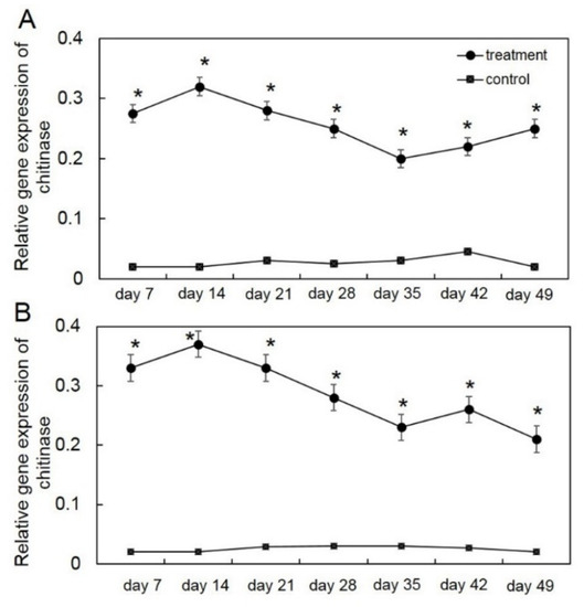 Relative gene expression of chitinase in the first crop (A) and second crop (B) through reverse transcription quantitative PCR (RT-qPCR) in Trichoderma asperelloides PSU-P1-treated muskmelon plants and control plants. * Indicates a significant difference between treatment and control according to Student’s t-test with p < 0.05.