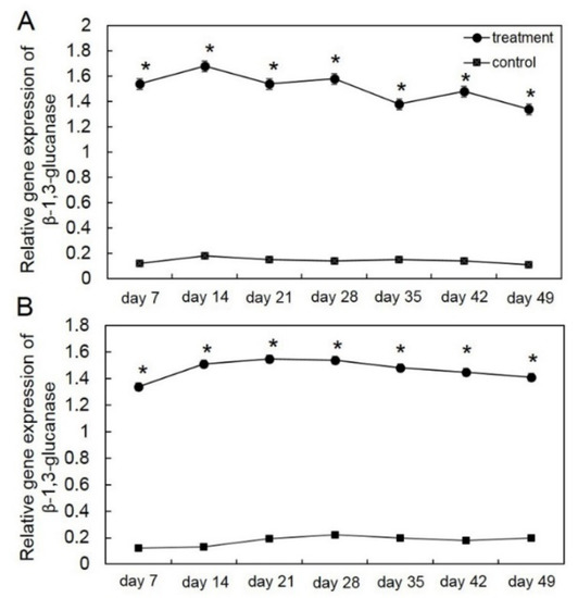 Relative gene expression of β-1,3-glucanase in the first crop (A) and second crop (B) through reverse transcription quantitative PCR (RT-qPCR) in Trichoderma asperelloides PSU-P1-treated muskmelon plants and control plants. * Indicates a significant difference between treatment and control according to Student’s t-test with p < 0.05.