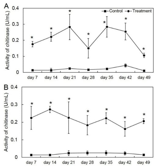 Activity of chitinase in the first crop (A) and second crop (B) through enzyme assay in Trichoderma asperelloides PSU-P1-treated muskmelon and control plants. * Indicates a significant difference between treatment and control according to Student’s t-test with p < 0.05.