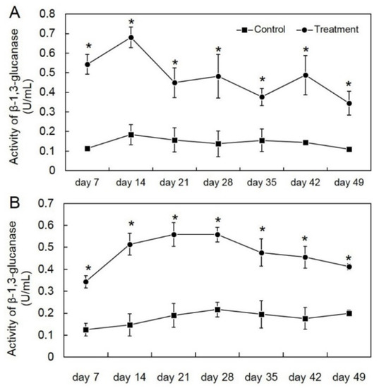 Activity of β-1,3-glucanase in the first crop (A) and second crop (B) through enzyme assay in Trichoderma asperelloides PSU-P1-treated muskmelon and control plants. * Indicates a significant difference between treatment and control according to Student’s t-test with p < 0.05.