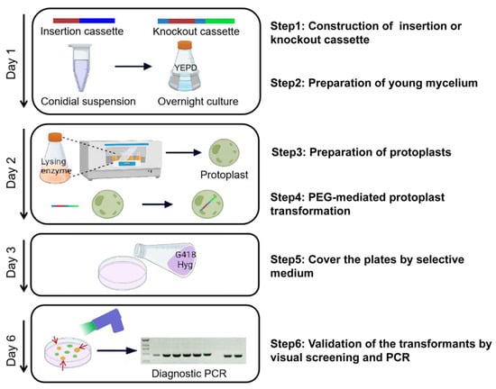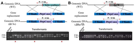 - Colot, H.V.; Park, G.; Turner, G.E.; Ringelberg, C.; Crew, C.M.; Litvinkova, L.; Weiss, R.L.; Borkovich, K.A.; Dunlap, J.C. A high-throughput gene knockout procedure for Neurospora reveals functions for multiple transcription factors. Proc. Natl. Acad. Sci. USA 2006, 103, 10352–10357. [Google Scholar] [CrossRef]