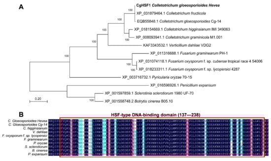 Bioinformatic analysis of CgHSF1. (A) The phylogenetic relationship of CgHSF1 and HSF1 proteins from some other plant pathogenic fungi. (B) Comparison of the conserved HSF DNA binding domain of fungal HSF1 proteins.