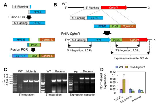 Construction of the repressive strain PniiA-Cghsf1. (A) Strategy for overlap PCR. The overlap nucleotides were indicated with the colors corresponding to relative fragments. Cghsf1-L indicate the nucleotides of 5′ part of Cghsf1 with about 800 bp. (B) Strategy for the construction of PniiA-Cghsf1 via recombination (C) Independent PCR diagnosis for the integration of the two recombinant fragments into the target locus, and diagnosis for correctness of the expression cassette. (D) Normalized expression level of Cghsf1 in WT and the mutant in response to nitrogen sources and during in planta stage. The β2-tubulin coding gene was used as an endogenous control for normalization. Values are shown as the means ± standard deviations (SD). Asterisks indicate significant difference at p < 0.01 (**).