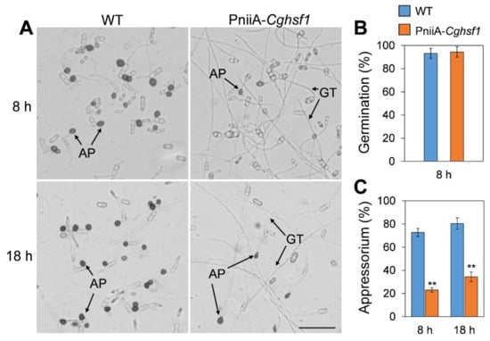To investigate whether CgHSF1 is involved in appressorium formation, the conidia of PniiA-Cghsf1 was inoculated onto polyester and the germination behavior was analyzed. The results showed that WT and PniiA-Cghsf1 had similar germination rates after incubation for 8 h (Figure 5B). In addition, about 73% of the WT conidia formed typical appressoria, together with the melanin deposition at the appressorium cell wall, whereas only 23% conidia of PniiA-Cghsf1 formed appressoria with abnormal shapes and longer germ tubes; furthermore, there is little melanin deposition in these abnormal appressoria. After incubation for another 10 h, over 80% of the WT conidia formed appressoria with obvious melanism; in comparison, only 34% conidia of PniiA-Cghsf1 formed appressoria, most of which are with abnormal shapes (Figure 5A,C).