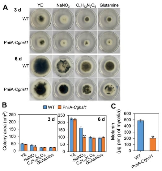 Growth analysis and measurement of melanin biosynthesis. (A) Colony morphology (bottom) of WT and the PniiA-Cghsf1 mutant after growth on minimal medium supplemented with yeast extract (YE, 2 g L−1), NaNO3 (20 mmol L−1), ammonium tartrate (C4H12N2O6) (10 mmol L−1), and glutamine (10 mmol L−1) as nitrogen sources. (B) Colony area after growth on minimal medium for 3 and 6 d. (C) Quantitation of melanin after growth in a liquid minimal medium supplemented glutamine for 3 d. Columns with asterisks indicate significant difference at p < 0.05 (*) and p < 0.01 (**).
