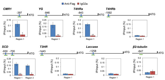 ChIP-qPCR assays indicated that CgHSF1 directly binds to the promoters of four melanin biosynthesis genes. The promoter structures are shown in the schematic diagrams. Blue boxes with numbers represent the positions of HSE elements to the translational start site. Green fragments represent the regions used for ChIP-qPCR. Values are the percentage of DNA fragments that were coimmunoprecipitated with specific anti-FLAG antibodies or non-specific antibodies relative to the input DNA. Error bars represent the standard deviations (SD) of three independent experiments. Asterisks indicate significant difference at p < 0.05 (*) and p < 0.01 (**) between samples co-immunoprecipitated with anti-FLAG and IgG2a.