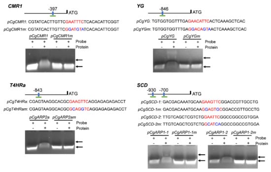 Gel mobility shift assays revealed that CgHSF1 directly binds to the HSE elements in the promoter region of four melanin biosynthesis genes. The native probe and mutated probe sequences corresponding to the promoters are shown, with red letters representing the HSE elements, and blue letters representing the mutated bases. Arrowheads indicate the specific complexes.