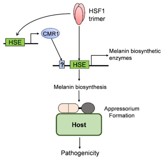 Taken together, we conclude that CgHSF1 is involved in the pathogenicity of C. gloeosporioides through the activation of melanin biosynthesis genes and the regulation of appressorium formation (Figure 10). Our study extends the understanding of fungal HSF1 proteins, especially their involvement in pathogenicity.
