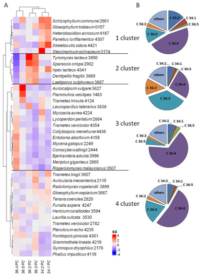 We have demonstrated the distribution of various PC molecular species in the members of Agaricomycetes class. Studied strains belong to 38 species, 26 families and 6 orders according to systema He et al. (2019) [30] (Table 1). The most strains split between two largest orders Agaricales (12 strains) and Polyporales (17 strains), whereas the rest orders count from 1 (Auriculares, Cantharellales, Phallales) to 5 (Russulales) strains. The majority of strains (34) relate to saprothroph fungi (S) and 5 strains—to biotroph ones (P), which are parasites on trees (Le) and mushrooms (Mm). Among saprothrophs, the xylotrophic fungi (Le) are dominated, 5 species inhabit on leaf-litter (St), 3—on humus and 1 species was collected on equine dung. In total, 29 species colonize different wooden substrates from living tree to very rotten fallen trunks including such specific substrates as pine cones and bark. Xylotrophic fungi are divided on species causing white (WR) or brown (BR) rot of wood according their enzymatic complexes and the ways of wood destroying. These features of strains are listed in the Table S1.