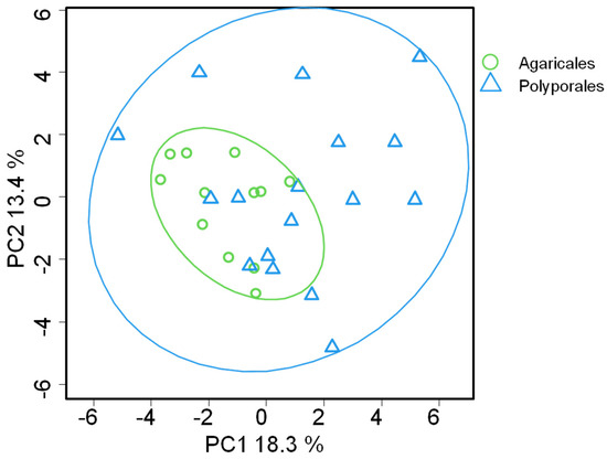 Discriminatory analysis of PC profiles from various basidiomycete strains was analyzed by PCA (Figure 4). Statistical difference between two orders is supported by PERMANOVA test P = 0.02 for first two principal component. The first and second principal components accounted for 13.4% and 18.3% of total sample variance, respectively. This method allowed to discriminate samples according to the taxonomical position of strains. The data represented in Figure 3 demonstrate that variability of PC profiles of Polyporales species exceeds that of Agaricales.