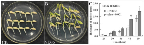 Effect of C. globosum strain ND35 on the radicle length of cucumber. (A): The radicle length of cucumber treated without strain ND35 at 48 h; (B): The radicle length of cucumber treated with strain ND35 at 48 h; (C): The time course of radicle length in different treatment. The spore concentration of C. globosum strain ND35 was 1 × 106 spores/mL. * indicates significant differences at p < 0.05, ** indicates significant differences at p < 0.01 (by t-test), the below is same.