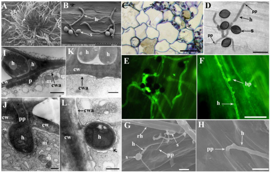 Infection and colonization of C. globosum strain ND35 in cucumber radicle. Under scanning electron microscopy, (A): The morphology of appendage of strain ND35 perithecium; (B): The morphology of hyphae from germinated ascospores of strain ND35. C-L: Colonization of hyphae of strain ND35 in cucumber radicle. Under light microscopy, (C): Several epidermal cells were infected by hyphae (arrowheads) of strain ND35, bars = 10 μm; (D): The hyphae of strain ND35 invaded cucumber root from a gap between epidermal cells of the root surface at 20 hpi (arrowheads), bars = 12 μm. (E–H): The hyphae developed from germinated germ tube penetrated the radicle from a gap between the epidermal cells at 20 hpi; (E) and (F): The hyphae of strain ND35 stained with goat anti-rabbit conjugated FITC and viewed with a fluorescence microscope, bars = 20 μm. Under scanning electron microscopy, (G): The hyphae of strain ND35 penetrated the cucumber from a gap between epidermal cells at 20 hpi, bars = 10 μm; (H): The hypha penetrated the epidermis from a gap between epidermal cells at 30 hpi, bars = 5 μm. (I–L): TEM imaging of defenses reaction of cucumber radicle cells at contacting or penetration sites and hyphae in outer cortical cells; (I): Papilla was formed in the inner wall of the epidermal cell when hyphae of strain ND35 between epidermal cells have contacted the outer wall of epidermal cells at 36 hpi, bars = 1 μm; (J): The hypha of strain ND35 penetrated the cell wall into the adjacent cortical cell at 36 hpi, bars = 0.5 μm; (K): Cell wall apposition was formed on adjacent cortical cell wall when hyphae have been growing in intercellular space contacting cell wall, bars = 0.5 μm; L: The hypha of strain ND35 in cortical cells were surrounded by the amorphous matrix (arrowheads), bars = 0.5 μm. cw: cell wall, cwa: cell wall apposition, m: mitochondrion, h: hypha, hp: hyphopodia, p: papilla, pp: penetration point, rh: root hair, s: spores of strain ND35.