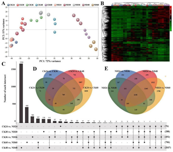 Gene expression profiling and the number of differentially expressed genes (DEGs) analysis in responding to the infection and colonization of C. globosum strain ND35 in cucumber radicle. (A): Principal Component Analysis (PCA) plots showing the differences between samples according to the genes expression; (B): Hierarchical clustering analysis showing the expression patterns of differentially expressed genes (DEGs) in different treatments, the color represents the expression level of differential genes (log2), the red represents the higher expression levels genes, and the green represents lower expression levels genes; (C–E): Venn diagrams showing overlap of DEGs between different treatments.