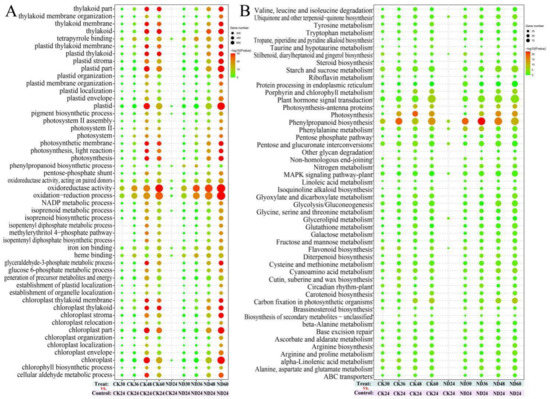 GO and KEGG enrichment analysis in responding to the infection and colonization of C. globosum strain ND35 in cucumber radicle. (A): Gene Ontology (GO) enrichment analysis; (B): Kyoto Encyclopedia of Genes and Genomes (KEGG) enrichment analysis. DEGs were classified into specific biological process categories and pathway categories with high classification stringency (p < 0.05). The circle size represents the number of genes in the category. The circle color represents the significance probability, red represents higher significance levels, green represents lower significance levels.
