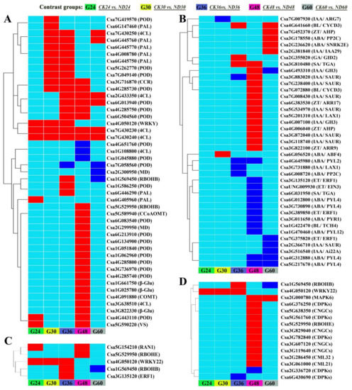 Gene expression patterns of major metabolic pathways in responding to the infection and colonization of C. globosum strain ND35 in cucumber radicle. (A): Phenylpropanoid biosynthesis; (B): Plant hormone signal transduction; (C): MAPK signaling pathway-plant; (D): Plant-pathogen interaction. The data point color indicates up-regulation (red), down-regulation (blue), and non-regulation (light blue) that is within the specified contrast group.