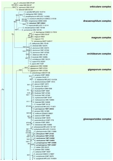 - Tao, G.; Liu, Z.Y.; Liu, F.; Gao, Y.H.; Cai, L. Endophytic Colletotrichum species from Bletilla ochracea (Orchidaceae), with descriptions of seven new speices. Fungal Divers. 2013, 61, 139–164. [Google Scholar] [CrossRef]