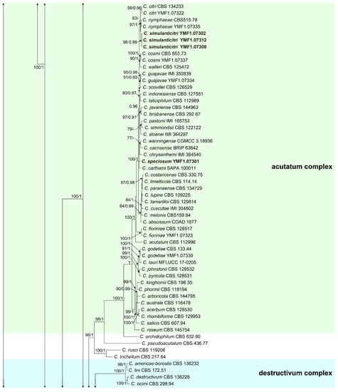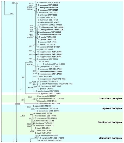 - Liu, F.; Weir, B.S.; Damm, U.; Crous, P.W.; Wang, Y.; Liu, B.; Wang, M.; Zhang, M.; Cai, L. Unravelling Colletotrichum species associated with Camellia: Employing ApMat and GS loci to resolve species in the C. gloeosporioides complex. Persoonia 2015, 35, 63–86. [Google Scholar] [CrossRef] [PubMed]