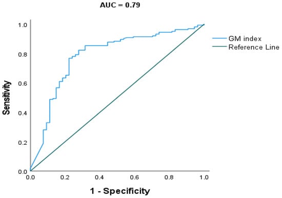 Receiver operating characteristic (ROC) analysis against mycological evidence gave an optimal GMI cut-off of 0.71. At a cut-off of 0.71, the sensitivity and specificity were 77% and 78%, respectively, with a Youden’s J index of 0.6 (AUC 0.79; C I: 0.71, 0.86; p < 0.001) (Figure 5).