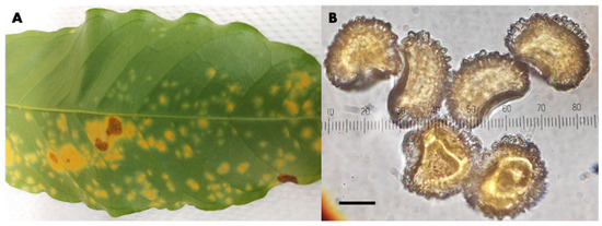 Hemileia vastatrix in Kona, Hawaii. (A) Infected coffee leaf; (B) characteristic hump-backed urediniospores; bar = 10 µm.