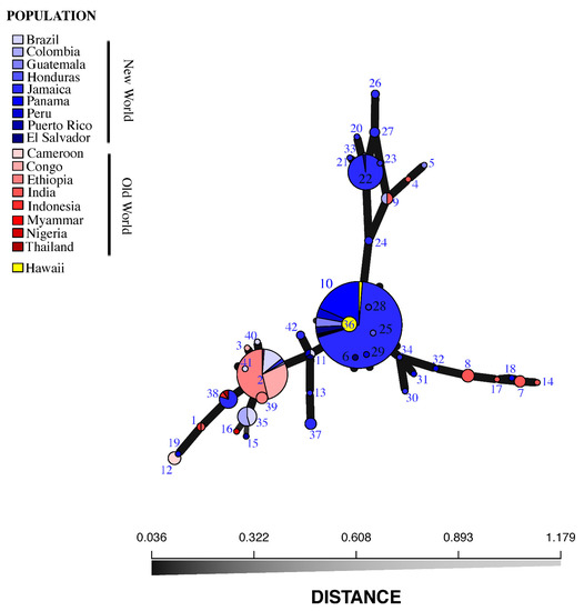 The distribution of MLGs shows the presence of several unique MLGs, as well as several that are shared (Figure S2). The specimens from Hawaii were all derived from MLG 10 (Figure 2), which comprises 226 isolates from Panama, Guatemala, El Salvador, Honduras, Puerto Rico, and Jamaica, plus one (of sixteen total) isolate from India, and eight (of nine total) isolates from Peru, all from C. arabica, with the exception of one isolate originating from C. canephora in Jamaica. The existence of identical genotypes (MLGs) in seven countries of Latin America and the Caribbean with a single isolate from India has been attributed to “founder effects” through old and/or recent epidemic events in uniform and susceptible coffee crops where genotypes are rapidly propagated without losing effective combinations of genes [29,44,45]. More importantly, the identification of MLGs from the predominantly Central American genotype suggests that the initial source of inoculum in Hawaii came from this region.