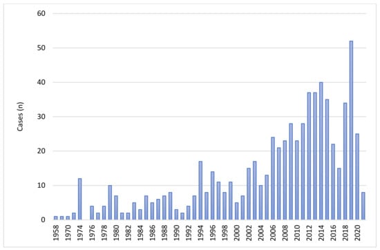 Cases of cutaneous mucormycosis per year from 1958 to 30 June 2021.