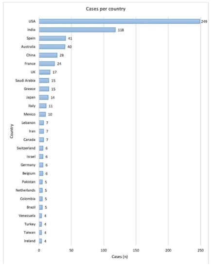 Geographic distribution of cases. Countries in the figure had at least four cases. The rest were: Thailand, Qatar, and Argentina had three cases each; Tunisia, Singapore, S. Korea, Poland, and Czech Republic had two cases each; Sweden, Portugal, Finland, Lithuania, Guatemala, Ecuador, Sri Lanka, Oman, Nepal, Kuwait, and South Africa had one case each.
