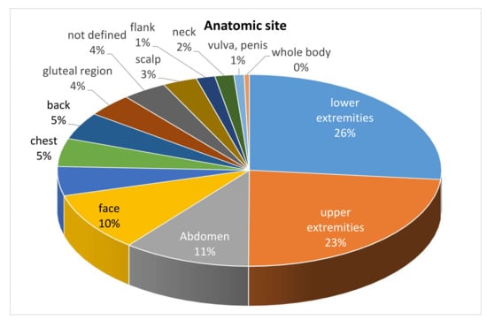 The upper and lower extremities were the most common sites of cutaneous mucormycosis, but any area of the skin could be affected (Figure 4).