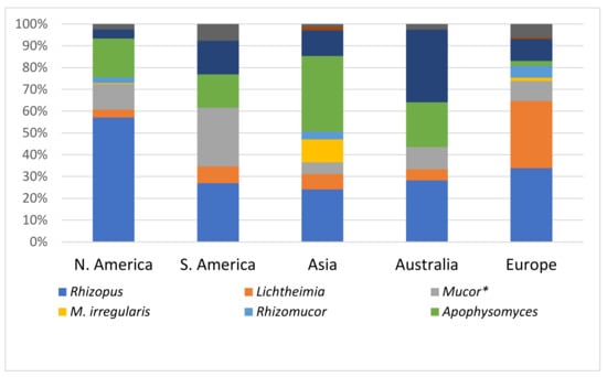 As shown in Figure 5, there was a significant geographic variation of Mucorales organisms causing cutaneous mucormycosis. In Europe, N. America, and S. America, the most common genus was Rhizopus spp. Of the 61 cases due to Lichtheimia spp., 40 (65.5%) were from Europe. This is consistent with findings from other studies [2,82]. In Asia, the most commonly isolated genus was Apophysomyces spp. (34.7%), followed by Rhizopus spp. [24%] and Saksenaea spp. [18%]. In several publications, it has been reported that Apophysomyces spp. and Saksenaea spp. can initiate disease in apparently normal hosts, following penetrating trauma during accidents in tropical and sub-tropical areas [45,83]. In the analysis of 122 cases of posttraumatic mucormycosis from the literature by Lelievre et al. [84], S. vasiformis and A. elegans complex were responsible for 9% and 18.9% of cases, respectively. In India, A. elegans is the second most common causative agent, after R. arrhizus [45]. In the current review, 33% of cases from Australia were due to Saksenaea spp., 28% to Rhizopus spp., and 20.5% to Apophysomyces spp., while in America and Europe, Rhizopus spp. was the most commonly isolated genus. Another species, which was found almost exclusively in cases from Asia (China and India), was Mucor irregularis. It should be noted, however, that several of the cases of Rhizomucor spp. reported from Europe, Asia, and N. America were in fact M. irregularis. Rhizomucor variabilis was renamed as M. irregularis because results of rDNA internal transcribed spacer (ITS) sequencing showed closer phylogenetic distance to Mucor species, especially M. hiemalis [85,86]. As molecular-based assays are evolving, they are used more often to aid in the detection or the identification of Mucorales.