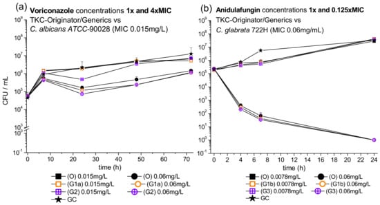 In the voriconazole setting, the originator and the 2 generics were tested against ATCC-90028 C. albicans (MIC 0.015 mg/L) with concentrations 1×, 4×, and 16× MIC. In the anidulafungin setting originator and the 2 generics were tested against 722H C. glabrata (MIC 0.06 mg/L) with concentrations 1×, 0.5×, 0.25×, and 0.125× MIC.