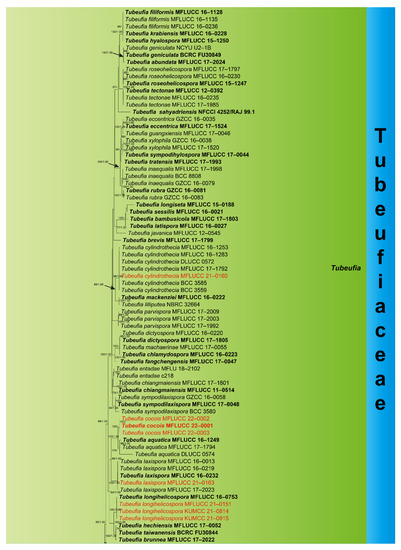 Phylogenetic analyses showed that our thirteen collections were placed within Tubeufiaceae viz: Dematiohelicomyces, Helicoma, Helicotruncatum, Neohelicosporium, Parahelicomyces, and Tubeufia. Eight collections clustered within Tubeufia; the new strain Tubeufia cylindrothecia (MFLUCC 21–0160) was nested with six strains of T. cylindrothecia with strong bootstrap support (98% ML/1.00 PP). Three strains of Tubeufia cocois (MFLUCC 22–0001, MFLUCC 22–0002, and MFLUCC 22–0003) clustered together and formed a branch at the basal clades of T. aquatica with strong bootstrap support (100% ML/1.00 PP). The new strain T. laxispora (MFLUCC 21–0163) nested with four strains of T. laxispora with strong bootstrap support (100% ML/1.00 PP), and T. longihelicospora (MFLUCC 21–0151, KUMCC 21–0478, and KUMCC 21–0479) clustered together within the same clade as T. longihelicospora (MFLUCC 16–0753). Parahelicomyces chiangmaiense (MFLUCC 21–0159) formed a single branch at the basal clades of Parahelicomyces members with strong support (97% ML). Newly obtained strain Helicotruncatum palmigenum (KUMCC 21–0474) nested with two strains of H. palmigenum (NMRC 32,663 and MFLUCC 15–0093) strong bootstrap support (100% ML/1.00 PP). Neohelicosporium bambusicola (MFLUCC 21–0160) was placed as a sister taxon to N. ellipsoideum (MFLUCC 16–0229) and N. acrogenisporum (MFLUCC 17–2019). New strain Dematiohelicomyces helicosporus (KUMCC 21–0473) clustered with three strains of Dematiohelicomyces helicosporus with strong bootstrap support (100% ML/1.00 PP), and Helicoma guttulatum (MFLUCC 21–0152) clustered with its ex-type strain of H. guttulatum (MFLUCC 16–0022) with high support (100% ML/1.00 PP).