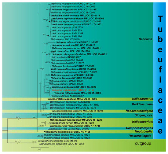 Tubeufiaceae is an interesting family with diverse morphologies, habitats, and a worldwide distribution [1,3,12,24]. The asexual morph of the Tubeufiaceae species is reported as helicosporous, chlamydosporous, and phragmosporous conidia, of which helicosporous conidia are the most common morphology in Tubeufiaceae. However, species with helicosporous conidia are not only found in Tubeufiaceae; for example, Helicoascotaiwania also has helicosporous conidia but it is phylogenetically distinct from Tubeufiaceae. Helicoascotaiwania is placed in Pleurotheciaceae and Sordariomycetes [58], while Tubeufiaceae is placed in Pleosporales. The interesting finding is that the asexual morphs of some genera were reported with two different morphologies. For example, Tubeufia and Berkleasmium produce both dictyosporous and helicosporous conidia, while Helicoma produces both helicosporous and phragmosporous conidia, confirmed by phylogenetic analyses [3].