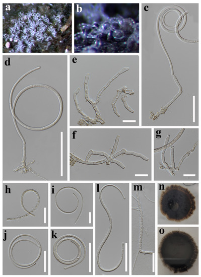 Figure 6. Parahelicomyces chiangmaiensis (MFLU 21–0188, holotype). (a,b) Colony on decaying wood; (c–g) conidiophores, conidiogenous cells, and conidia; (h–m) conidia; (n) germinated conidium; (o) colony cultures on PDA (observe and reverse). Scale bars: (a) = 500 µm, (b) = 200 µm, (e,f,k–m) = 20 µm, (c,d,g–j,n) = 10 µm.