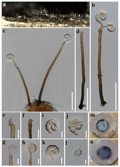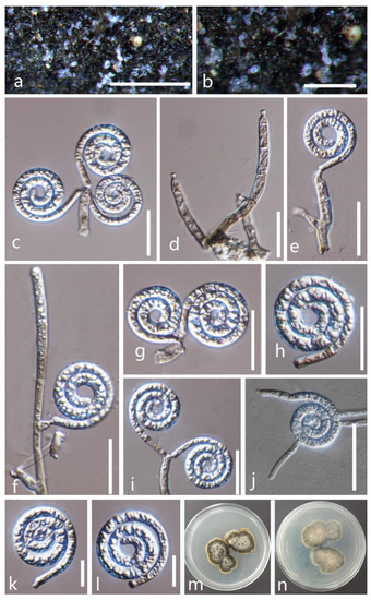 Figure 5. Neohelicosporiumbambusicola (MFLU 21–0189, holotype). (a,b) Colony on culms of bamboo; (c,e–g,i) conidiogenous cells and conidia; (d) conidiophores; (h,k,l) conidia; (j) germinated conidium; (m,n) colony cultures on PDA (observe and reverse). Scale bars: (a) = 500 µm, (b) = 200 µm, (e,f,k,l) = 20 µm, (c,d,g–j) = 10 µm.