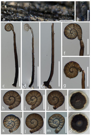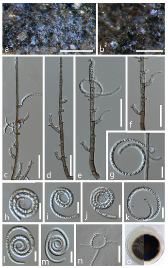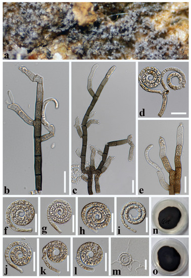 Figure 2. Dematiohelicomyces helicosporus (MFLU 21–0184). (a,b) Colony on decaying wood; (c,d) conidiophores and conidia; (e–g) conidiophores and conidiogenous cells; (h–l) conidia; (m) germinated conidium; (n,o) colony cultures on PDA (observe and reverse). Scale bars: (j) = 80 µm, (d) = 60 µm, (c,h,i,k–m) = 40 µm, (e–g) = 20 µm.