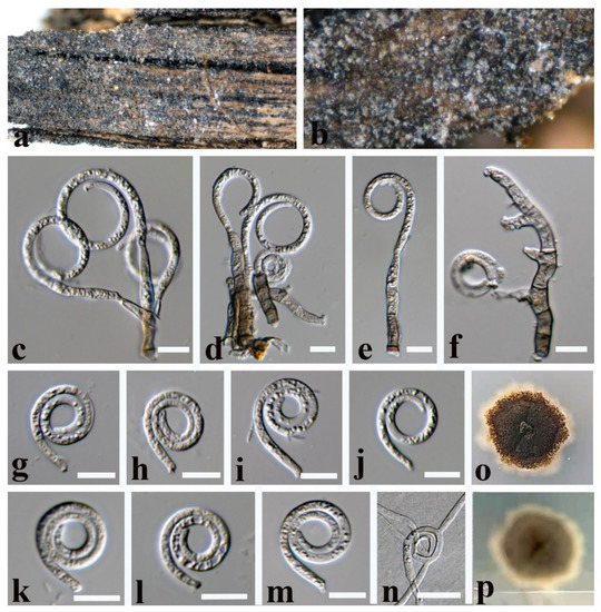 Figure 10. Tubeufia longihelicospora (MFLU 21–0182). (a,b) Colony on decaying wood; (c–f) conidiophores, conidiogenous cells, and conidia; (g,h) stalked sclerotia; (i–m) conidia; (n) germinated conidium; (o,p) colony cultures on PDA (observe and reverse). Scale bars: (n) = 40 µm, (c–m) = 20 µm.