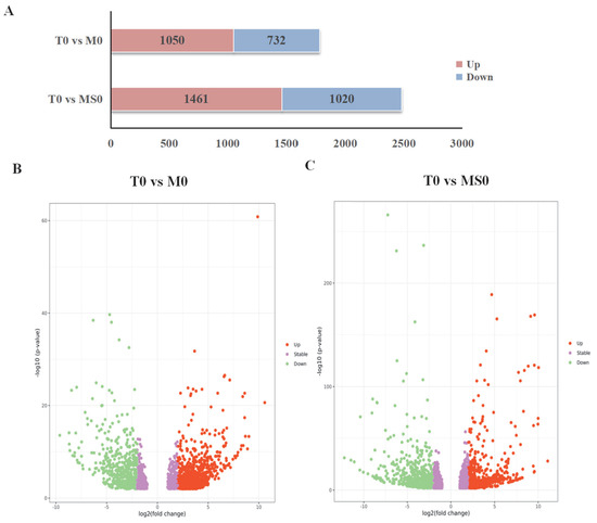 Analyzing the DEGs among the control and mutant samples may be useful for further clarifying the regulatory effects of the signal-transduction-related C. gloeosporioides membrane proteins. Genome-wide transcriptional profiling of M0 and MS0 detected substantial transcriptional changes to 19–26% of the genes. A total of 1788 DEGs were detected in the T0 vs. M0 comparison, of which 1056 and 732 were upregulated and downregulated, respectively. Additionally, 2481 DEGs were detected in the T0 vs. MS0 comparison, of which 1461 and 1020 were upregulated and downregulated, respectively. The overall DEG distribution is presented in Figure 2A. The significant DEGs (i.e., adjusted fold-change ≥ 2 and corrected p < 0.01) (Figure 2B,C).