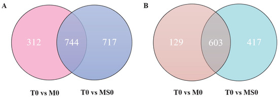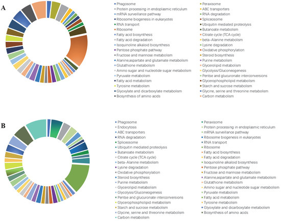 Kyoto Encyclopedia of Genes and Genomes (KEGG) pathway enrichment analysis of the DEGs in the Colletotrichum gloeosporioides mutants. (A) T0 vs. M0 comparison. (B) T0 vs. MS0 comparison. The KEGG pathways were classified into hierarchical categories according to the KEGG website (https://www.kegg.jp/kegg/kegg2.html, accessed on 17 January 2022). T0, wild-type C. gloeosporioides conidia; M0, ΔCgMsb2 conidia; MS0, ΔCgMsb2Sho1 conidia.
