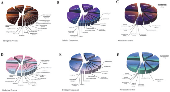 The Gene Ontology (GO) classification of DEGs. GO classification of identified DEGs based on their functional annotations in response to various samples was conducted according to the GO resource (http://geneontology.org/, accessed on 17 January 2022). (A–C) Indicate biological processes, cellular components, and molecular function under mutant CgMsb2, while (D–F) indicate biological processes, cellular components, and molecular function under mutant CgMsb2sho1, respectively.