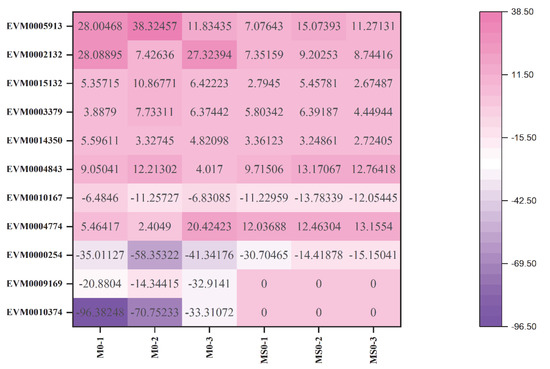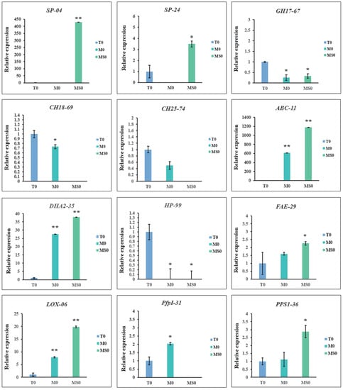 Results of the qRT-PCR validation of key candidate DEGs in the M0 and MS0 samples. Error bars represent the standard deviation for three independent replicates. Asterisks indicate significant differences (** p < 0.01; * p < 0.05).