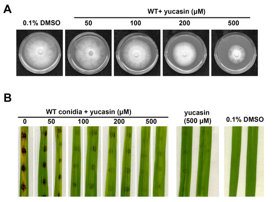 Figure 5. IAA biosynthesis inhibitor suppressed M. oryzae growth and pathogenesis. (A) Wild-type (WT) strain was grown on PA medium supplemented with yucasin of different concentrations, kept in dark under 28 °C. Photographs were taken at 7 dpi. PA medium containing 0.1% DMSO was set as solvent control. (B) Yucasin was added to the wild-type (WT) conidial suspension (2000/droplet) to reach the indicated final concentration. Photos were taken at 7 dpi. Rice leaf explants inoculated with yucasin solution (500 μM) served as a blank/mock control, and 0.1% DMSO as a solvent control.