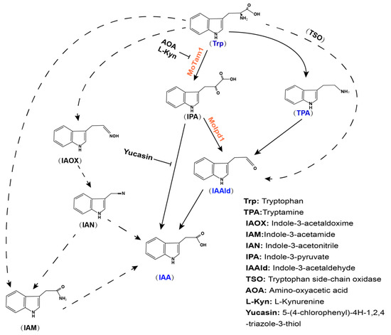 35. Oberhansli, T.; Defago, G.; Haas, D. Indole-3-acetic acid (IAA) synthesis in the biocontrol strain CHA0 of Pseudomonas fluorescens Role of tryptophan side chain oxidase. J. Gen. Microbiol. 1991, 137, 2273–2279. [Google Scholar] [CrossRef] [Green Version]