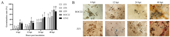 Germination of smut teliospores on buds of different varieties. (A) Germination rates on buds of ZZ1, ZZ6, ZZ9, ROC22, and GT42 after inoculation with smut teliospores at 6, 12, 24, and 48 h post inoculation (hpi). (B) Observation of germination of smut teliospores on buds 48 h post inoculation. Arrow indicates germ tube emerging from the germinating teliospore; bars = 25 μm. Values followed by the same letter are not significantly different as per Tukey’s test (p < 0.05).