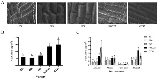 Quantification and observation of wax on buds of different varieties. (A) Presence of wax on buds was observed by scanning electron microscopy; bars = 10 μm. (B) Total wax content on buds of ZZ1, ZZ6, ZZ9, ROC22, and GT42. (C) Content of alkanol, alkane, alkanal, and fatty acids. Values followed by the same letter are not significantly different as per Tukey’s test (p < 0.05).