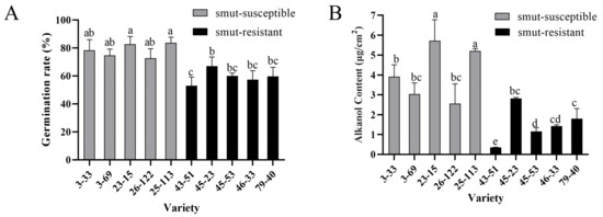 Alkanol content and smut teliospores germination on buds of smut-resistant and smut-susceptible clones of ROC25 × YZ89-7 F1 generation. (A) Smut teliospores germination rate on buds of smut-resistant and smut-susceptible clones of ROC25 × YZ89-7 F1 generation. Values followed by the same letter are not significantly different as per Tukey’s test (p < 0.05). In this experiment, the concentration of smut teliospore suspension was 5 × 106 CFU/mL and the buds were incubated at 28 °C and 90% RH for 48 h. (B) Alkanol content on buds of different clones. Values followed by the same letter are not significantly different as per Tukey’s test (p < 0.05).